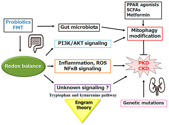Against the polycystic kidney diseases, however, those interventions with probiotics/prebiotics may be somewhat inadequate in regard to the improvement of the kidney function [109,110]. What are the additional factors/signaling required? Firstly, some antioxidants and/or redox balance might be valuable, as mentioned in the previous section. For example, significant studies have suggested that metformin exerts its favorable effect by various mechanisms, including affecting mitochondrial function, restoring of redox balance, and modulating the gut microbiome, which may be apart from the AMPK-dependent mechanism [112]. Preceding studies have shown the inhibition of nuclear factor (erythroid-derived 2)-like 2 (Nrf2), which is involved in regulating the expression of antioxidant proteins such as heme-oxygenase 1(HO-1) and/or catalase in animal models of chronic kidney disease (CKD), and it also may increase the inflammation and oxidative stress [113]. Resveratrol may be favorable for saving the redox balance, which is a polyphenolic chemical compound isolated from Veratrum grandiflorum with a diversity of biological activities, including antioxidant and/or anti-inflammatory properties [114]. In fact, resveratrol administration could inhibit HIF-1α expression, which may reduce the production of hypoxia-induced reactive oxygen species (ROS) [115]. Secondly, some factors involved in the tryptophan and kynurenine pathway might also be conceivable, which has been shown to be associated with immune-related diseases [116]. Several studies have described abnormal expression of the genes-encoding factors of the immune response in autosomal-dominant polycystic kidney disease, in which the immune system and/or infiltration of immune cells may be mostly stimulated [117]. The events associated with inflammation and/or activation of the immune system might promote the pathology of PKD [118]. Therefore, both polycystic kidney and autosomal-dominant polycystic kidney disease may be also categorized as immune-related diseases. Shaped by repetitive inflammatory conditions, an “engram” might commit to a mild progression of several immune-related diseases [116]. If that is the case in PKD, a certain “engram” modulation with the modification of gut microbiome might be beneficial for a superior treatment tactic against PKD [116]. (Figure 3) Additionally, a substantial proportion of PKD patients may experience hypertension prior to kidney dysfunction [119]. Remarkably, a significant proportion of PKD patients with normal kidney function may also progress to hypertension prior to the development of polycysts, suggesting that PKD2 channels can regulate blood pressure, probably through an extrarenal mechanism [120]. Hypertension is an important prognosticator of the disease progression, which might be the most frequent cause of death in patients with autosomal-dominant polycystic kidney disease. Angiotensin-converting enzyme inhibitors may be used as therapeutic agents in the treatment of hypertension in autosomal-dominant polycystic kidney disease [121]. The therapeutic benefit of using angiotensin-converting enzyme inhibitors may contribute to treating hypertension, as well as to diminishing renal cyst growth in the autosomal-dominant polycystic kidney disease [122].