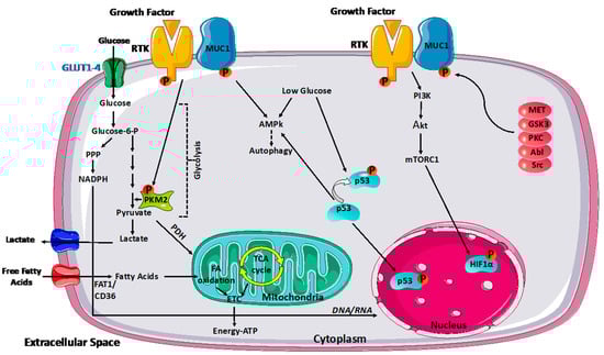 MUC1 modulation of cancer metabolism. MUC1 modulates glycolytic flow by activating various signaling pathways, including PI3K/Akt/mTOR, p53, and HIF-1α, influencing glycolytic gene transcription. Under glucose-depleted circumstances, MUC1 activates AMPK, which supports survival by inducing autophagy. MUC1-RTK interaction enhances RTK membrane stability. As a result, the complex enhances downstream signaling of RTK, which can affect PKM2 activity and transcriptional activation of other glycolytic genes. Reciprocally, RTKs phosphorylate MUC1 and facilitate signaling downstream of MUC1. MUC1 also interacts directly with glycolytic enzymes such as PKM2 to control carbon flux. Moreover, protein kinase C (PKC), glycogen synthase kinase 3 (GSK3), tyrosine–protein kinase Abl, non-receptor tyrosine kinase (Src), and tyrosine–protein kinase MET can all phosphorylate MUC1.