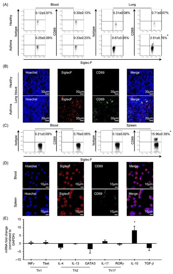 CD69 expression and cytokines profiling of mouse eosinophils. (A) Surface expression of isotype IgG and CD69 on peripheral blood and lung eosinophils in the healthy and asthmatic mouse models using flow cytometry (n = 6). (B) Immunofluorescence staining of healthy and asthmatic lung tissue sections stained with antibodies, with corresponding isotypes IgG, Siglec-F, and CD69. (C) Surface CD69 expression on eosinophils from peripheral blood and the spleen in naive IL-5 transgenic (Tg) mice (n = 5 for each group). (D) CD69 expression observed using immunofluorescence staining in the eosinophils purified from the blood and spleen of naive IL-5Tg mice. (E) qPCR analysis of Th1, Th2, and Th17 cytokines; transcription factors; IL-10; and TGF-β mRNA expression in the CD69+ eosinophils purified using a cell sorter. Relative gene expressions were calculated with ΔΔCt method using sorted CD69− eosinophils as the reference (n = 4 for each group). Data are expressed as mean ± SEM. * indicates a significant difference compared with healthy mice, blood, or CD69− eosinophils (p < 0.05).