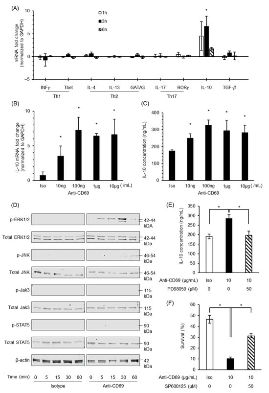 Functional role and signaling pathway of CD69 on eosinophils following CD69 crosslinking. (A) qPCR analysis of the Th1, Th2, and Th17 cytokines, transcription factors, IL-10, and TGF-β mRNA expression at 1, 3, and 6 h after 10 μg/mL CD69 crosslinking on eosinophils. The mRNA expressions on CD69+ eosinophils were compared with those on non-stimulated eosinophils (isotype), which were considered as reference (n = 3 for each group). (B,C) mRNA expression and protein level of IL-10 after corresponding isotype IgG, 10 ng, 100 ng, 1 μg, or 10 μg/mL CD69 crosslinking on eosinophils for 3 h and 24 h, respectively (n = 4 for each group). * indicates a significant difference from isotype group (p < 0.05). (D) Phosphorylation and total Erk1/2, STAT5, Jak3, and JNK protein and β-actin expression in eosinophils purified from IL-5 Tg mouse following crosslinking by 10 μg/mL CD69 antibody or matched control via Western blot analysis. IL-10 secretion (E) and % survival of eosinophils (F) following 10 μg/mL CD69 crosslinking on eosinophils purified from the spleen of IL-5 Tg mice for 24 h culture in the absence (positive control group) or presence of 50 μM PD98059 (n = 4) and 50 µM SP600125 (n = 4), respectively. Data are expressed as mean ± SEM. * indicates a significant difference from 10 μg/mL anti-CD69 stimulation without inhibitor treatment group (positive control group) using a two-way ANOVA (p < 0.05). Original figures can be found in Supplementary Materials.