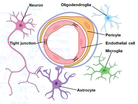 The neurovascular unit (NVU), proposed by scientists in 2001, is composed of several components including neurons, astrocytes, microglia, oligodendrocytes, vascular endothelial cells (ECs), perivascular cells (PCs), vascular smooth muscle cells, the basement membrane, and the extracellular matrix [36]. The tubular arrangement of capillaries within the brain is composed of ECs, while PCs and astrocyte endfeet enclose the perimeter of this tubular structure. Surrounding the outermost part of the tubules is a basement membrane, which consists of an extracellular matrix. Together with neurons, oligodendroglia, and microglia, these components constitute the NVU (Figure 1). In recent years, with the deepening of neuroscience research, the NVU has received increasing attention.
