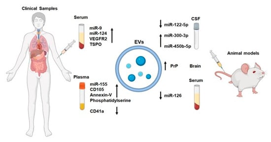 As depicted in Figure 2, NVU-EVs might be early biomarkers for IS. In a rat transient ischemic attack (TIA) model, the trend of changes in CSF exosomal miRNA levels was consistent with the trend of changes in plasma exosomal miRNA levels. Li et al. found that the level of miR-122-5p decreased in a 10 min TIA model and that miR-300-3p levels increased in a 5 min TIA model [102]. Luo et al. found that the level of miR-450b-5p increased in a 10 min TIA model compared with control rats [103]. The above studies suggest that circulating/CSF exosomal miR-122-5p, miR-300-3p, and miR-450b-5p could be promising biomarkers for TIA. miR-9 and miR-124 are two brain-specific miRNAs that can be detected in serum EVs. By comparing the levels of serum exosomal miR-9 and miR-124 in patients with IS and volunteers without stroke, researchers concluded that the levels of miR-9 and miR-124 are positively correlated with the National Institutes of Health Stroke Scale (NIHSS) score, serum IL-6 concentration, and infarct volume [104]. This finding suggests that miR-9 and miR-124 in serum EVs could be potential biomarkers for diagnosing IS and evaluating the degree of IS injury. Additionally, the activation of microglia is closely related to poor prognosis in IS, but it is difficult to measure the activation of microglia in vivo [105,106,107]. EVs in plasma are allowed for non-invasive measurement and are cell-specific indicators that might reflect the activation state of microglia [108]. EVs originating from activated microglia contain characteristic proteins (microglial protein TMEM119 and the Toll-like receptor 4 coreceptor CD14) [109]. Roseborough et al. found that the number of TMEM119+/CD14+ EVs in plasma was increased after IS in rats, which indicated the increased microglia activation [109]. This finding demonstrated that EVs derived from activated microglia in the plasma had great potential as prognostic markers for IS. Picciolini et al. found that the level of vascular endothelial growth factor receptor 2 (VEGFR2) in activated microglia-derived EVs in the serum and the level of translocator protein (TSPO) in neuron or microglia-derived EVs in the serum significantly increased after IS [110]. These data meant that serum exosomal VEGFR2 and TSPO might be sensitive biomarkers of IS. Additionally, recent studies have revealed the increased level of phosphatidylserine, Annexin-V, and CD105 and decreased level of CD41a in EC-EVs circulating in the plasma of IS patients [111,112]. Brenna et al. found that prion protein levels were significantly increased in brain-derived EVs in mice with IS and prion protein might contribute to intercellular communication [113]. Zhang et al. found that the number of EC-EVs and level of miR-155 in EC-EVs in the plasma significantly increased in the early and middle stages after IS, were positively correlated with the cerebral ischemic infarction area and NIHSS score, and were related to large-artery atherosclerosis and cardioembolism subtypes [114]. The level of miR-126 in EC-EVs in the serum was found to be decreased at 3 h after cerebral ischemia in rats and to return to normal levels after 24 h [115]. Therefore, serum exosomal miR-126 might be a sensitive biomarker of IS. Together, all of these studies (Table 1) support the potential of bioactive substances from circulating EVs as an early biomarker for IS and a key player in IS development.