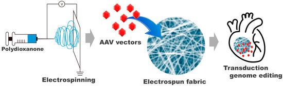Schematics of fabrication of adeno-associated virus (AAV) vector-loaded electrospun polydioxanone (PDO) nonwoven fabrics and its application to delivery of AAV vectors to the heart.