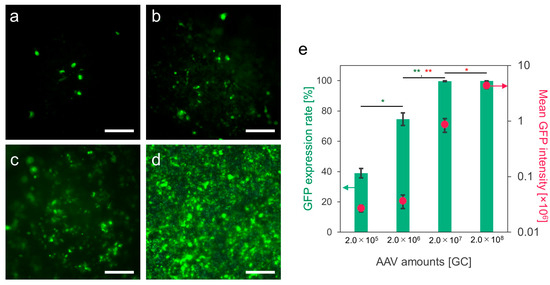 Transduction to HEK293 cells on PDO nonwoven fabrics with scAAV-GFP vectors. Fluorescence images of the transduced cells on the fabrics (green) with the vectors obtained by soaking in the solutions containing (a) 2.0 × 105, (b) 2.0 × 106, (c) 2.0 × 107, and (d) 2.0 × 108 GCs of the vectors. Scale bars represent 200 μm. (e) GFP expression rates were calculated from the number of cells expressing GFP, along with the mean GFP intensity. Data represent means ± SDs. * p < 0.05, ** p < 0.01.