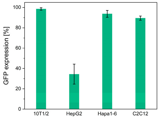 The versatility of the transduction to various cell types was investigated by culturing mouse fibroblast 10T1/2, human hepatoma HepG2, mouse hepatoma Hepa1-6, and mouse muscle C2C12 cells for 5 days on the PDO fabrics obtained by the treatment with the solution containing 2.0 × 107 GCs of scAAV-GFP vectors. All the cells expressed GFP (Figure 5). The GFP expression rates of the 10T1/2, HepG2, Hepa1-6, and C2C12 cells were 98.5 ± 1.2%, 34.4 ± 9.8%, 93.7 ± 3.3%, and 89.5 ± 2.0%, respectively (Figure 5). These results demonstrate the potential of electrospun PDO fabrics as a versatile platform for AAV vector delivery to various cell types. The difference in the degree of transduction, typically indicated by the lowest GFP expression in HepG2 cells, does not pose a problem in our system. The transduction efficiency of AAV vectors varies significantly between cell types due to factors such as the cell surface receptor expression, serotype specificity, and promoter activity [27,28,29]. It is out of the scope of this study, but modifications to the AAV capsid or the use of alternative serotypes with different receptor specificities could improve the transduction rates in HepG2 cells [27,28,29].