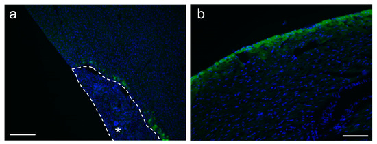 Transduction to mouse tissues with attached electrospun PDO nonwoven fabrics with scAAV-GFP vectors. Representative images of immunostaining of GFP-positive cells (green) with nucleic staining by Hoechst 33342 (blue) of the (a) liver and (b) heart, 7 days after their attachment. The scale bars represent 200 μm. * panel (a): PDO fabric adhering to the liver surface.