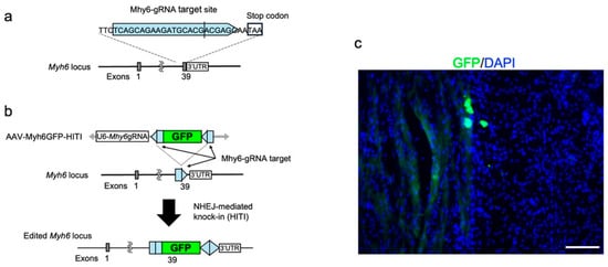 The gRNA cloning plasmid (gRNA_cloning vector), GFP-expression self-complementary AAV plasmid (pscAAV-CAG-GFP), GFP-containing plasmid (pCAG-1BPNLS-Cas9-1BPNLS-2AGFP), Cas9-expression AAV plasmid (pAAV-nEFCas9), and AAV donor backbone plasmid (pAAV-rMERTK-HITI) were obtained from Addgene (Addgene 41824, 83279, 87109, 87115, and 87119, respectively). To construct the myosin heavy chain 6 (Myh6) target gRNA-expression vector (mMyh6-gRNA), we designed the Myh6 target sequence (20 bp target and 3 bp PAM sequence (underlined)) as follows: GCAGCAGAAGATGCACGACGAGG. The Myh6 target was subcloned into the gRNA_cloning vector according to a previously reported protocol (https://media.addgene.org/data/93/40/adf4a4fe-5e77–11e2–9c30–003048dd6500.pdf (20 April 2020, date last accessed)) with the primers 5′- TGGCTTTATATATCTT