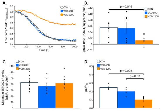 Calcium uptake and SERCA2a affinity for calcium declines by the end of perimenopause. SERCA2a-mediated calcium uptake in cardiac homogenates taken from control or VCD-injected mice was monitored over time (Figure 1A). While calcium uptake in samples from VCD 60D hearts exhibited a similar time course as those from control mouse hearts, cardiac homogenates taken at 120D post-VCD injection had a drastically reduced calcium uptake profile. In turn, the rate of calcium uptake obtained during the linear portion of the curve (150–400 s) in control and VCD 60D hearts were 0.055 ± 0.015 and 0.053 ± 0.019 per mg protein per min, respectively (Figure 1B). VCD 120D hearts exhibited a ~76% decline in calcium uptake rate compared to that in controls, with a mean rate of 0.013 ± 0.007 per mg protein per min. When assessing SERCA2a activity, or the ability of SERCA2a to hydrolyze ATP, there were no differences found in maximal SERCA2a activity (Figure 1C). However, pCa50—a measurement of calcium sensitivity—decreased from 6.25 ± 0.02 in control samples to 6.20 ± 0.02 at VCD 60D, indicative of a greater calcium requirement to elicit half Vmax, albeit this difference was not statistically significant (Figure 1D). In contrast, in the 120D VCD group, the decline in calcium sensitivity reached 6.10 ± 0.03, which was significantly different from both control (p = 0.002) and VCD 60D (p = 0.02) hearts. Together these data show that the physiological performance of SERCA2a was significantly impaired by the end of the perimenopausal phase, with a reduction in calcium uptake presumably due to a decrease in calcium sensitivity.