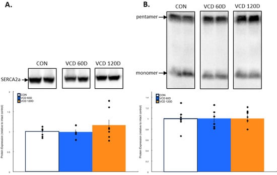 Perimenopause does not impact SERCA2a or phospholamban expression in the heart. (A) SERCA2a or (B) phospholamban expression. There were no significant differences in the expression of SERCA2a or phospholamban in VCD 60D or VCD 120D compared to those in controls. Key: CON, control; VCD 60D, samples taken at 60 days after the start of VCD injections; VCD 120D, samples taken 120 days after start of VCD injections. All data are presented as the mean ± SEM. N = 6 to 8 in each group.