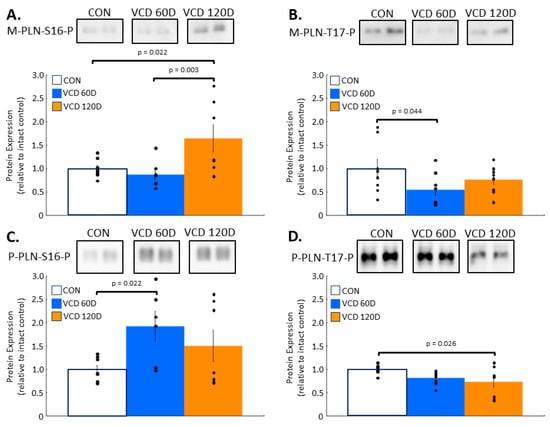 Phospholamban phosphorylation is dynamically altered by perimenopause. Phospholamban regulation of SERCA2a activity is affected by phosphorylation at two known sites, both of which decrease inhibition and allow for an increase in SERCA2a activity and calcium uptake. Monomeric phospholamban exhibited a 64.5 ± 29.1% increase in S16 phosphorylation in 120D VCD samples compared to that in controls (p = 0.022) and was on average 77% higher than in 60D VCD samples (p = 0.003) (Figure 3A). T17 phosphorylation of monomeric phospholamban declined to 54.9 ± 12.5% of control levels by 60D post-VCD injections (p = 0.044) and remained 23.6 ± 10.6% below control levels by 120D VCD, which was not significantly different (Figure 3B).