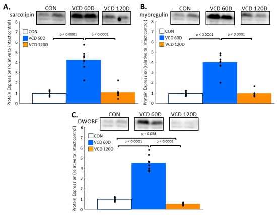 Peptide regulators of SERCA2a activity exhibit dynamically altered expression in perimenopause. In addition to phospholamban, there are several other peptide regulators of SERCA. Sarcolipin inhibits SERCA activity directly and indirectly through phospholamban [25], while myoregulin has similar inhibitory effects through direct SERCA binding [26]. By contrast, DWORF enhances SERCA function by displacing the inhibitor regulators phospholamban, sarcolipin, and myoregulin [27]. Immunoblotting revealed significant increases over control levels that exceeded 4-fold changes in the expression of sarcolipin (Figure 4A), myoregulin (Figure 4B), and DWORF (Figure 4C) by 60D VCD (p < 0.0001 for all). By the end of the perimenopausal phase, the expression of sarcolipin and myoregulin had returned to levels similar to those of controls, while DWORF was 49.5 ± 3.2% lower than control levels (p = 0.038). Given DWORF’s stimulatory effect on SERCA activity, the reduced expression seen at 120D VCD was consistent with the reduced calcium removal activity we found at the same timepoint.
