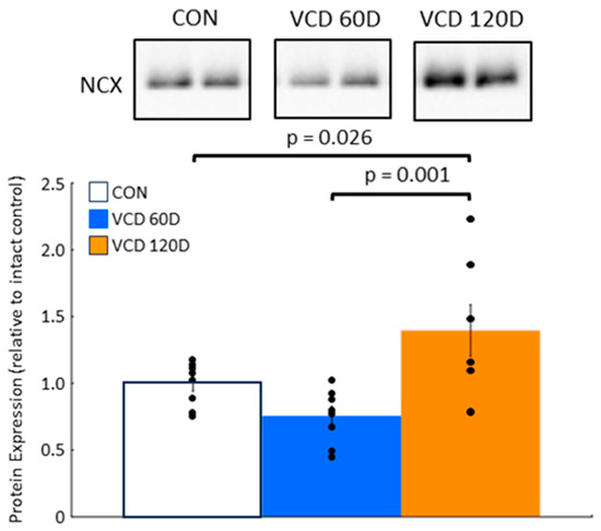 Na+–Ca2+ exchanger expression is increased at the end of perimenopause. Reduced SERCA2a function exposes cardiomyocytes to the risk of calcium overload. In stressed hearts, increased expression of the sarcolemmal Na+–Ca2+ exchange is a mechanism that can acutely compensate for impaired sarcoplasmic reticulum calcium removal. In 60D VCD samples, Na+–Ca2+ exchanger expression declined by 24.4 ± 7.1%, although this change did not reach statistical significance (p = 0.14) (Figure 5). In 120D VCD samples where SERCA2a-mediated calcium uptake was noted to be significantly reduced, Na+–Ca2+ exchanger expression increased by 39.6 ± 19.3% over control levels (p = 0.026). These data suggest that the calcium overload produced by reduced SERCA2a activity was compensated for by increasing Na+–Ca2+ exchanger expression to eject calcium into the extracellular environment.