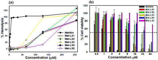 Hemolytic and cytotoxic activities of melittin and Mel-LX3. (a) Percentage of hemolysis of sRBCs induced by the peptides. (b) Percentage of cell viability in RAW264.7 mouse macrophages. Cell viability was assessed using an MTT dye reduction assay.