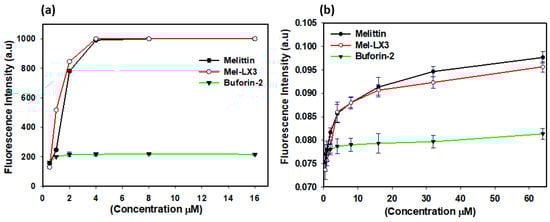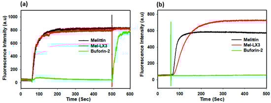 Many AMPs with an amphipathic α-helical structure permeabilize the cytoplasmic membrane of Gram-positive bacteria, causing a breakdown in transmembrane potential, resulting in cell death [46]. We assessed the effects of melittin and Mel-LX3 on the membrane depolarization of Gram-positive S. aureus by monitoring the fluorescence intensity of diSC3-5, a dye that is sensitive to potential (Figure 3a). Buforin-2, known to be an intracellular target without membrane permeabilization, was used as a negative control. Both melittin and Mel-LX3 at two times the MIC induced rapid depolarization of the membrane against S. aureus. Both peptides caused depolarization of the cytoplasmic membrane, which increased fluorescence within 2 min. We then evaluated the membrane permeability of S. aureus using SYTOX green, which is a cationic dye that can only pass through compromised membranes (Figure 3b). Buforin-2 as a negative control did not affect fluorescence intensity, but both melittin and Mel-LX3 at 2 × MIC resulted in a rapid increase in fluorescence, reaching the highest levels within 2 min. These results imply that the primary antimicrobial mechanism of Mel-LX3 is related to membrane permeabilization of Gram-positive S. aureus.