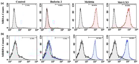 A flow cytometric analysis was conducted to evaluate the membrane integrity of drug-resistant bacteria (MRSA and MDRPA) following treatment with melittin and Mel-LX3 (Figure 5). Propidium iodide (PI), a DNA intercalating dye, was used as an indicator to assess membrane integrity and cell death via flow cytometry. In the absence of peptides, minimal PI staining was observed in the bacteria, indicating intact cell membranes. As expected, the negative control, buforin-2, resulted in less than 10% PI staining of the bacteria, suggesting that buforin-2 does not disrupt the bacterial membrane. In contrast, both melittin and Mel-LX3 led to significant PI staining, with melittin resulting in 98% and 97% PI staining of MRSA and MDRPA, respectively, and Mel-LX3 inducing 94% PI staining of both MRSA and MDRPA. These findings suggest that both peptides are capable of damaging the bacterial cell membrane. This analysis supports the hypothesis that Mel-LX3 damages bacterial cell membrane integrity, potentially contributing to its antimicrobial properties against these resistant bacteria.