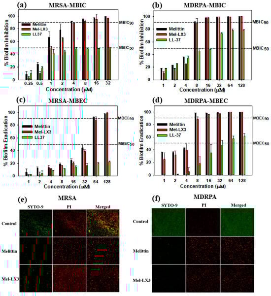 Antibiofilm activity of melittin and Mel-LX3 against drug-resistant bacteria. (a) Biofilm inhibition by peptides against MRSA. (b) Biofilm inhibition by peptides against MDRPA. (c) Biofilm eradication by peptides against MRSA. (d) Biofilm eradication by peptides against MDRPA. The dashed lines represent the 50% and 90% inhibition and eradication concentrations. Visualization of antibiofilm properties of the peptides against (e) MRSA and (f) MDRPA. Live and dead cells are illustrated in green (SYTO 9) and red (PI) fluorescence, respectively.