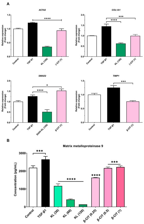 Crude KL extract and β-CIT attenuate the expression of hepatic-fibrosis-associated genes and mitigate MMP-9 production in LX-2 cells challenged with TGF-β1. Following a 24 h co-treatment protocol, mRNA was extracted and subjected to real-time qRT-PCR analysis. Expression levels were normalized to the housekeeping gene GAPDH (A), revealing a marked downregulation of fibrosis-related genes. Furthermore, a statistically significant reduction in MMP-9 levels was observed in the cell culture supernatant (B). Statistical significance was denoted as follows: p < 0.0332 (*), p < 0.0002 (***), p < 0.0001 (****).