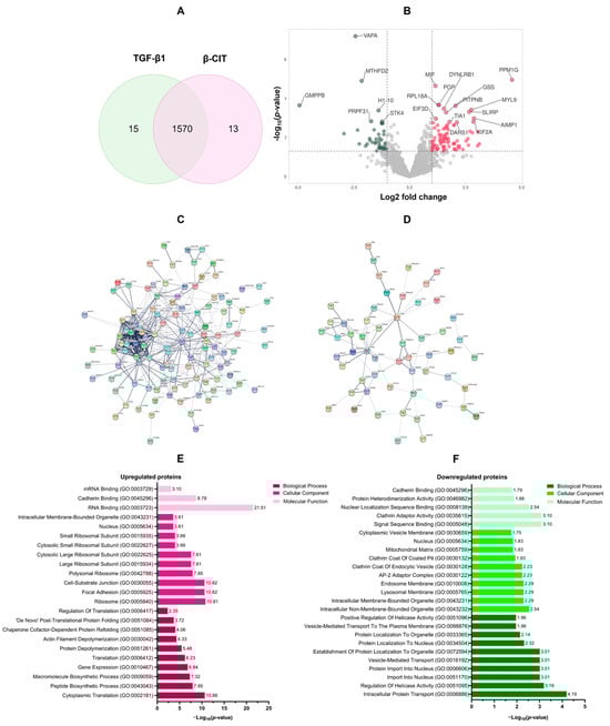 To elucidate the impact of β-CIT on TGF-β1-induced LX-2 cells, a 48 h treatment regimen with β-CIT was implemented. Subsequent protein extraction and LC-MS/MS analysis yielded a total of 1570 overlapping proteins present in both TGF-β1 treatment alone and β-CIT co-treatment conditions (Figure 3A). Rigorous filtering parameters were applied (log2 fold change of ±1.5 and p-value < 0.05), resulting in the identification of 125 upregulated and 65 downregulated proteins (Figure 3B). A list of differentially expressed proteins (DEPs) is shown in Table 2. Further analysis of these DEPs was conducted utilizing protein–protein interaction (PPI) network visualization, revealing intricate relationships among the DEPs (Figure 3C,D).