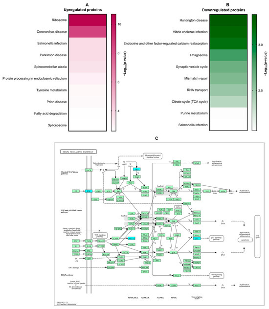 The KEGG analysis of DEPs. Amongst the most significantly enriched KEGG signaling pathways, differential protein expression patterns emerged (upregulated: A; downregulated: B). Notably, the MAPK signaling pathway exhibited a pronounced association with downregulated proteins (C; indicated in blue).