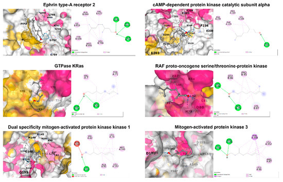 Binding interactions between β-citronellol and potential protein targets were examined using the cavity detection-guided blind docking capabilities of the CB-Dock2 web-based platform. Detailed results, including Autodock Vina binding scores and the amino acids involved in the interactions, are outlined in Table 3. A visualization of the protein–ligand interactions in 2D and 3D formats can be found in Figure 5. Of particular interest, β-citronellol displayed favorable binding scores (−4 to −6 Kcal/mol) with target proteins known to participate in the MAPK signaling pathway.