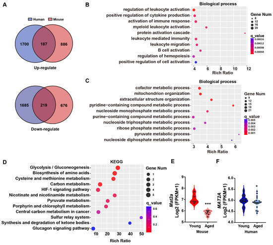 Decreased MAT2A expression in the aged skeletal muscle of humans and mice. (A) Venn diagram of age-related DEGs in the skeletal muscle of humans and mice, p-adjust < 0.05. (B) GO enrichment of upregulated genes in the skeletal muscle, q_value < 0.05. (C) GO enrichment of downregulated genes in the skeletal muscle, q_value < 0.05. (D) KEGG enrichment of cofactor metabolism-related genes. (E) Mat2a expression in the skeletal muscle of young mice (3 months, n = 5) and elderly mice (26 months, n = 5). (F) MAT2A expression in the skeletal muscle of young humans (19~25 years, n = 20) and elderly humans (66~71 years, n = 18). Statistical analysis was performed using the Student’s t-test. Data are presented as mean ± SD. * p < 0.05, *** p < 0.001.