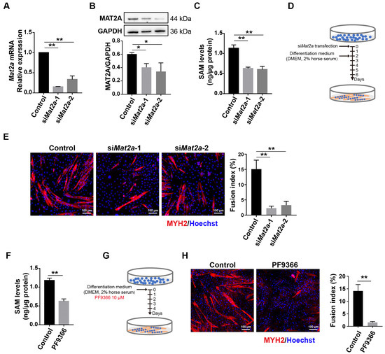 Inhibition of MAT2A expression or activity hindered differentiation of C2C12 cells. (A) qPCR for the mRNA expressions of Mat2a in C2C12 cells treated with siMat2a for 48 h. Statistical analysis by one-way ANOVA. (B) Western blotting for the protein expression of MAT2A in C2C12 cells treated with siMat2a for 48 h. Protein levels, normalized to GAPDH, were estimated by densitometry. Statistical analysis by one-way ANOVA. (C) ELISA for SAM levels in C2C12 cells treated with siMat2a for 48 h. Statistical analysis by one-way ANOVA. (D) The C2C12 cells were transfected with siMat2a for 48 h and then differentiated in DMEM supplemented with 2% horse serum for 4 days. (E) Immunofluorescence staining for MYH2 (red) and nuclei (blue) after 4 days of induced differentiation in C2C12 cells treated with siMat2a. Scale bar: 100 µm. Quantification of the fusion index after these treatments is shown in the histogram. Statistical analysis by one-way ANOVA. (F) ELISA for SAM levels in C2C12 cells treated with PF9366 for 48 h. Statistical analysis was conducted using the Student’s t-test. (G) The C2C12 cells were treated with PF9366 and then differentiated in DMEM supplemented with 2% horse serum for 4 days. (H) Immunofluorescence staining for MYH2 (red) and nuclei (blue) after 4 days of induced differentiation in C2C12 cells treated with PF9366. Scale bar: 100 µm. Quantification of the fusion index after these treatments is shown in the histogram. Statistical analysis was conducted using the Student’s t-test. Each assay was conducted in triplicate. Data are presented as mean ± SD. * p < 0.05, ** p < 0.01 vs. control.