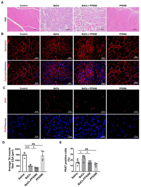 PF9366 inhibited skeletal muscle repair after BaCl2-induced injury in vivo. (A) H&E staining for tibialis anterior (TA) muscles of young mice (4 months, n = 4~5) treated with BaCl2, BaCl2 + PF9366, and PF9366 for 7 days. Saline was used as the control. Scale bar: 100 µm. (B) Immunofluorescence staining for dystrophin (red) and nuclei (blue) in TA muscles of young mice (4 months, n = 4~5) treated with BaCl2, BaCl2 + PF9366, and PF9366. Saline was used as the control. Scale bar: 50 µm. (C) Immunofluorescence staining for PAX7 (red) in TA muscles of young mice (4 months, n = 4~5) treated with BaCl2, BaCl2 + PF9366, and PF9366. Saline was used as the control. Scale bar: 25 µm. (D) Tibialis anterior (TA) cross-sectional area measured by immunofluorescence staining of dystrophin. (E) Quantification of the percentage of PAX7-positive cells in muscle of mice. Means were compared using two-way ANOVA. Data are presented as mean ± SD. * p < 0.05, *** p < 0.001.