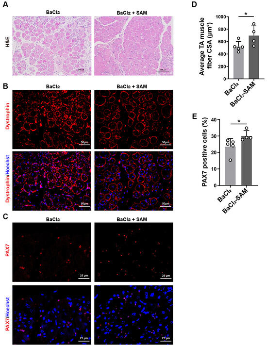 Supplementation of SAM promoted skeletal muscle repair after BaCl2-induced injury. (A) H&E staining for tibialis anterior (TA) muscles of young mice (4 months, n = 4~5) treated with BaCl2 and SAM for 7 days. Saline was used as the control. Scale bar: 100 µm. (B) Immunofluorescence staining for dystrophin (red) and nuclei (blue) in TA muscles of young mice (4 months, n = 4~5) treated with BaCl2 and SAM. Saline was used as the control. Scale bar: 50 µm. (C) Immunofluorescence staining for PAX7 (red) in TA muscles of young mice (4 months, n = 4~5) treated with BaCl2 and SAM. Saline was used as the control. Scale bar: 25 µm. (D) Tibialis anterior (TA) cross-sectional area measured by immunofluorescence staining of dystrophin. (E) Quantification of the percentage of PAX7-positive cells in muscle of mice. Means were compared using two-way ANOVA. Data are presented as mean ± SD. * p < 0.05.