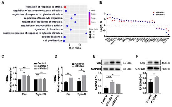 MAT2A inhibition increased the expression of Fas in C2C12 cells. (A) GO enrichment of DEGs in C2C12 cells treated with siMat2a. (B) Fold changes of the expression of 27 DEGs regulating the response to stress. (C,D) qPCR was used to measure the mRNA levels of Fas and Tspan32 in C2C12 cells treated with siMat2a and PF9366. Comparison of means by two-way ANOVA. (E) Western blotting for the protein expression of Fas in C2C12 cells with Mat2a knockdown. Protein levels, normalized to GAPDH, were estimated by densitometry. Comparison of means by one-way ANOVA. (F) Western blotting for the protein expression of Fas in C2C12 cells treated with PF9366. Protein levels, normalized to GAPDH, were estimated by densitometry. Student’s t-test was used to compare means. Each assay was conducted in triplicate. Data are presented as mean ± SD. “ns” indicates not significant (p > 0.05), * p < 0.05, ** p < 0.01.