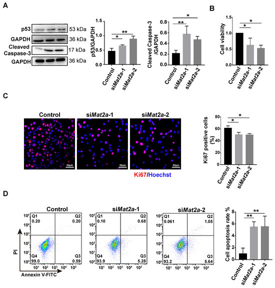 Knockdown of MAT2A inhibited the proliferation and induced apoptosis in C2C12 cells. (A) Western blotting for p53 and cleaved caspase-3 in C2C12 cells treated with siMat2a. Protein levels, normalized to GAPDH, were estimated by densitometry. Means were compared using one-way ANOVA. (B) MTT for the viability of C2C12 cells treated with siMat2a for 48 h. Statistical analysis by one-way ANOVA. (C) Immunofluorescence staining for Ki67 (red) and nuclei (blue) in C2C12 cells treated with siMat2a for 48 h. Scale bar: 50 µm. One-way ANOVA was used to compare the percentage of Ki67-positive cells. (D) Annexin V-FITC/PI flow cytometric detection of apoptosis in C2C12 cells treated with siMat2a. The percentage of apoptotic cells was compared using one-way ANOVA. Each assay was conducted in triplicate. Data are presented as mean ± SD. * p < 0.05, ** p < 0.01.
