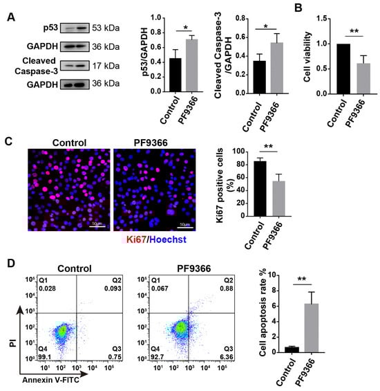 PF9366 inhibited the proliferation and induced apoptosis in C2C12 cells. (A) Western blotting for p53 and cleaved caspase-3 in C2C12 cells treated with PF9366. Protein levels, normalized to GAPDH, were estimated by densitometry. The Student’s t-test was used to compare means. (B) MTT for the viability of C2C12 cells treated with PF9366 for 48 h. The Student’s t-test was used to compare means. (C) Immunofluorescence staining for Ki67 (red) and nuclei (blue) in C2C12 cells treated with PF9366 for 48 h. Scale bar: 50 µm. The Student’s t-test was used to compare the percentage of Ki67-positive cells. (D) Annexin V-FITC/PI flow cytometric detection of apoptosis in C2C12 cells treated with PF9366. The Student’s t-test was used to compare means. Each assay was conducted in triplicate. Data are presented as mean ± SD. * p < 0.05, ** p < 0.01.
