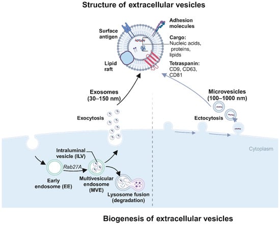 Biogenesis and structure of extracellular vesicles (EVs) (created with BioRender.com (accessed on4 August 2024)). This diagram illustrates the biogenesis and structural characteristics of extracellular vesicles (EVs), specifically exosomes and microvesicles. Structure of extracellular vesicles: The diagram highlights EVs’ surface and internal components. EVs are lipid bilayer-enclosed structures displaying surface antigens (e.g., CD9, CD63), adhesion molecules, and cargo, including nucleic acids (DNA, RNA), proteins, lipids, and metabolites. Exosomes (30–150 nm in diameter) are typically depicted with a detailed cargo composition that facilitates various cellular functions and signaling pathways. Exosome formation: The formation begins within the cell cytoplasm, where early endosomes (EE) containing intraluminal vesicles (ILVs) mature into multivesicular endosomes (MVE) under the influence of Rab27A. MVEs then fuse with lysosomes for degradation or fuse with the plasma membrane to release ILVs as exosomes into the extracellular space (exocytosis). Microvesicle formation: Microvesicles (100–1000 nm in diameter) are formed by the plasma membrane’s direct outward budding and fission (ectocytosis).