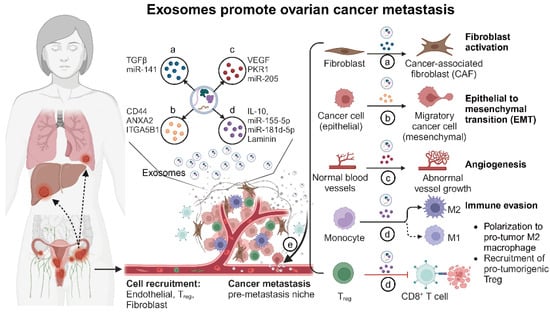 The majority of ovarian cancer metastases occur in the peritoneal cavity, with cancer cells spreading throughout the abdominal region [15]. Exosomes derived from ovarian cancer cells have been demonstrated to play a role in this process through the induction of epithelial–mesenchymal transition (EMT) in peritoneal mesothelial cells, thereby enhancing their invasive capabilities [16,17]. Additionally, exosomes contribute to the remodeling of the extracellular matrix and the creation of a pre-metastatic niche, thereby further facilitating cancer cell dissemination [3]. Additionally, these vesicles play a pivotal role in angiogenesis, a process vital for supplying nutrients and oxygen to growing tumors, and in immune evasion, enabling cancer cells to evade detection and destruction by the host’s immune system [18,19].