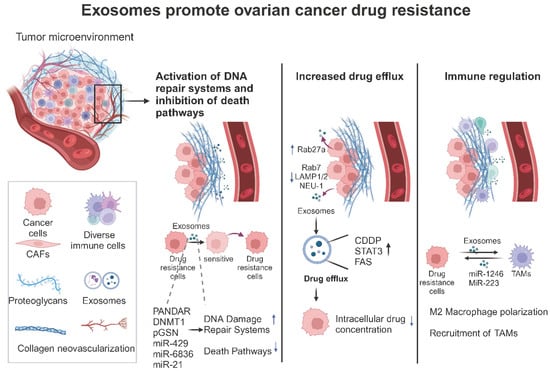 Recent studies investigating the interplay between tumor-associated immune cells and exosomes in ovarian cancer, particularly concerning mechanisms of drug resistance, are primarily centered on tumor-associated macrophages (TAMs) [119]. TAMs are the predominant immune cell population in the ovarian tumor microenvironment, characterized by high plasticity. They can be easily polarized into an immunosuppressive M2-like phenotype by colony-stimulating factor-1 released by tumor cells, which is closely linked to ovarian cancer progression and chemoresistance [87].