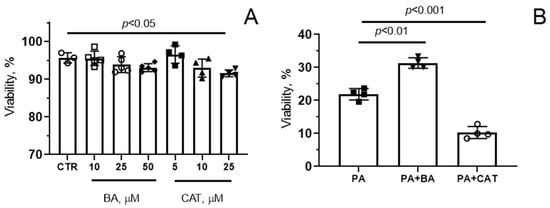 Figure 1B demonstrates that palmitic acid (0.75 mM) caused significant cell death, and the number of surviving cells decreased by almost 80% after 6 days of incubation (in the control group (CTR), the cell viability index (%) was 96.0 ± 3.0, as in Figure 1A). Pre-treatment of cells exposed to these conditions with 25 μM BA led to a significant increase in this index (at the end of the experiment, the number of living cells was 31%). At the same time, 10 µM CAT reduced the survival of endothelial cells under dyslipidemia conditions.