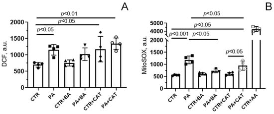 MitoSOX-based assays showed that in mitochondria, bongkrekate significantly suppressed PA-induced overproduction of ROS (the PA + BA group, Figure 2B). Interestingly, this effect of BA was not observed when determining total ROS production in the entire cell cytoplasm in experiments using the DCF probe (Figure 2A). Altogether, these data allow us to conclude that the main site of ROS formation under lipotoxic conditions is the mitochondrial respiratory chain. It is well known that under lipotoxic conditions, non-mitochondrial antioxidant systems can be damaged and/or cellular prooxidant systems (e.g., NADPH oxidases, endoplasmic reticulum, and peroxisomes) can also be activated, thereby increasing the overall production of ROS in the cell [47]. One can suggest that bongkrekate is unable to reduce the cytoplasmic pool of ROS.