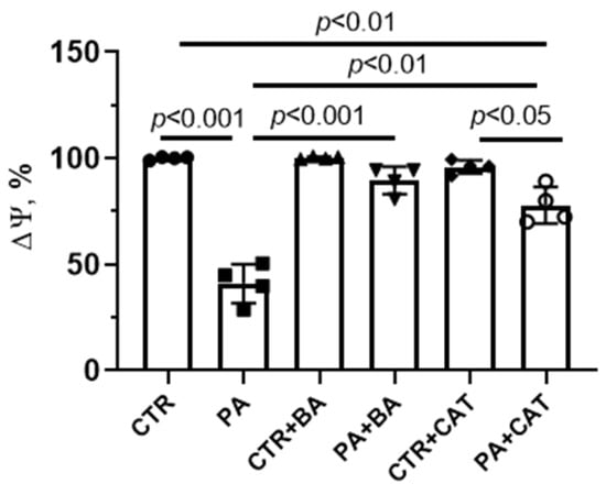 Effect of bongkrekic acid (BA, 25 µM) and carboxyatractyloside (CAT, 10 µM) on mitochondrial membrane potential (Δψ) in mouse lung endothelial cells under conditions of palmitate-induced lipotoxicity (0.75 mM PA/fatty acid-free BSA complex solution for 48 h). Data represent the mean ± SD from four independent experiments.
