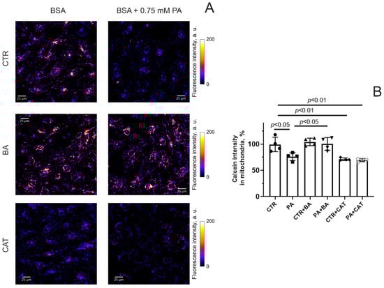 One can see that the fluorescence intensity of calcein (in the presence of cobalt ions) in endothelial cells exposed to 0.75 mM palmitic acid (for 48 h) significantly decreased (Figure 4B). This suggests that the spontaneous opening activity of the MPT pore in endothelial cells increases under hyperlipidemic conditions. Incubation of endothelial cells with 25 μM BA under conditions of hyperlipidemia resulted in a significant increase in calcein fluorescence intensity (Figure 4). This indicates that BA can inhibit the MPT-pore opening in the inner mitochondrial membrane in endothelial cells under conditions of hyperlipidemic stress. Preincubation of endothelial cells with 10 μM CAT both under normal and hyperlipidemic conditions caused a decrease in calcein fluorescence compared to the CTR group. In parallel, there was also a tendency for this indicator to decrease compared to the PA group. This may be due to the fact that CAT itself causes spontaneous opening of the MPT pore.