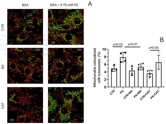 Figure 5 shows that under conditions of 48 h hyperlipidemia, the colocalization of mitochondria and lysosomes significantly increased, which may indicate increased mitochondrial elimination. In this case, the incubation of endothelial cells with 25 μM BA led to a decrease in the level of colocalization of mitochondria and lysosomes. On the contrary, 10 µM CAT did not have such an effect. In the PA + CAT group, the colocalization of lysosomes and mitochondria was higher than in the CTR and CTR + CAT groups, and it did not differ significantly from that in the PA group.