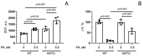 Changes in production of reactive oxygen species (A) and mitochondrial membrane potential (Δψ) (B) in HEK293T cells with normal (WT) and reduced (ANT2-) expression of ANT2 under conditions of PA-induced lipotoxicity (0.5 mM PA/fatty acid-free BSA complex solution for 48 h). Conditions: 0—BSA solution, 0.5 PA—0.5 mM palmitate/BSA complex solution. Data represent the mean ± SD from four independent experiments, including at least 25 fields of view.