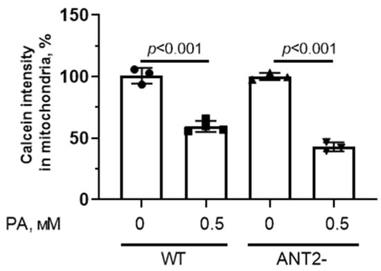MPT pore opening in HEK293T cells with normal (WT) and reduced expression of ANT2 (ANT2-). Intensity of calcein fluorescence in HEK293T cell mitochondria from four experimental groups. Conditions: 0—BSA solution, PA—0.5 mM palmitate/BSA complex solution. Data represent the mean ± SD from 3–4 independent experiments, including at least 25 fields of view.