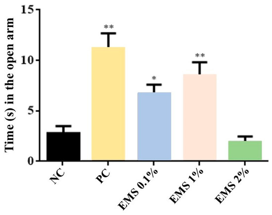 Time (in seconds) spent in the open arms of the elevated plus maze by animals exposed for 5 min to inhalation of Myrcia sylvatica essential oil at doses of 0.1%, 1%, and 2% (2 s) (n = 8). Values represent the mean ± standard deviation. * p < 0.05, ** p < 0.01, compared to the negative control group using ANOVA and Tukey’s test. NC = negative control, PC = positive control. EMS: Myrcia sylvatica essential oil.
