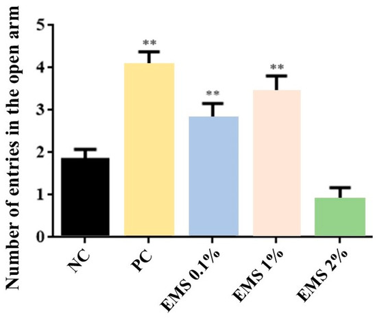 Number of entries into the open arms of the elevated plus maze by animals exposed for 5 min to inhalation of Myrcia sylvatica essential oil at doses of 0.1%, 1%, and 2% (n = 8). Values represent the mean ± standard deviation. ** p < 0.01, compared to the negative control group using ANOVA and Tukey’s test. NC = negative control, PC = positive control. EMS: Myrcia sylvatica essential oil.