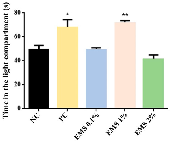 Time spent (seconds) in the light compartment of the light–dark box test by animals exposed to 5 min of inhalation of Myrcia sylvatica essential oil at doses of 0.1%, 1%, and 2% (n = 6). Values represent the mean ± standard deviation. * p < 0.05, ** p < 0.01, compared to the negative control group using ANOVA and Tukey’s Test. NC = negative control, PC = positive control. EMS: Myrcia sylvatica essential oil.