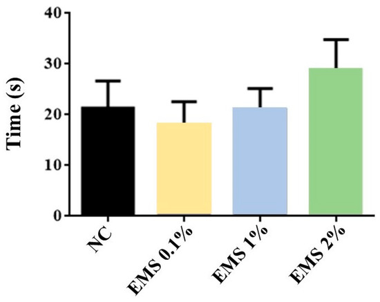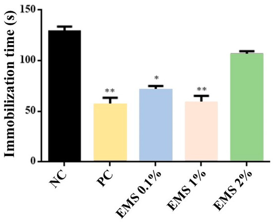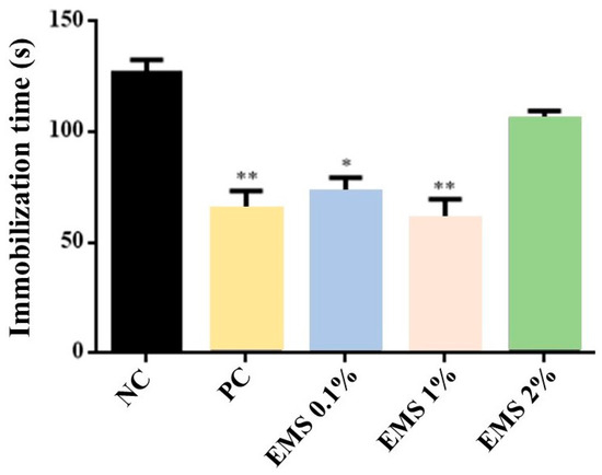 Latency time to immobility during forced swimming of animals exposed to inhalation of Myrcia sylvatica essential oil at doses of 0.1%, 1%, and 2% (n = 6) for 5 min. The values represent the mean ± standard deviation. * p < 0.05, ** p < 0.01, compared to the negative control group using ANOVA and Tukey’s test. NC = negative control, PC = positive control. EMS: Myrcia sylvatica essential oil.
