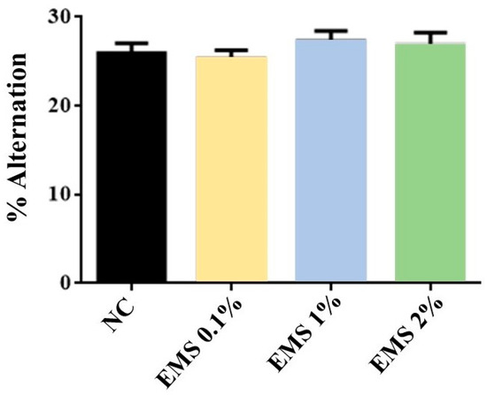 Percentage of alternation in the arms of the Y-maze in animals exposed to 5 min of inhalation of Myrcia sylvatica essential oil at doses of 0.1%, 1%, and 2% (n = 8). Values represent the mean ± standard deviation. p < 0.05; p < 0.01, compared to the negative control group using ANOVA and Tukey’s Test. NC = negative control. EMS: Myrcia sylvatica essential oil.