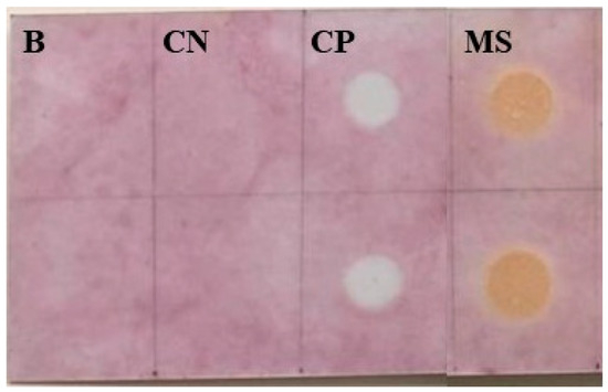 Direct bioautography on silica gel chromatoplates (CCD) of the anticholinesterase activity of the essential oil of Myrcia sylvatica and the standard physostigmine. (B) blank, (CN) negative control: methanol, (CP) positive control: physostigmine (100 μg/mL). MS = EO of M. sylvatica.