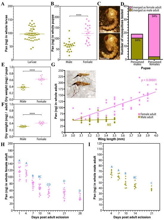Pan levels in developmental stages of A. stephensi. (A). Larval Pan levels. Pan levels were measured in whole late 4th instar larvae. Larvae were thoroughly washed in distilled water prior to homogenization. N = 39. (B). Whole body Pan levels in pupae were measured from individuals that pupated within the last 24 h. Pupae were visually inspected and grouped into predicted males or females based on their size. **** = p < 0.0001. (C). Representative images of male (Top) and female (Bottom) pupae are shown. (D). A subset of pupae was randomly selected and allowed to eclose to determine their sexes. 84% of the putative male pupae emerged as male adults (16/19), while 94% of the putative female pupae emerged as female adults (32/34). Data were analyzed by unpaired Student’s t-test to assess whether female pupae had more Pan than male pupae (p < 0.0001). (E). Total dry weight of pupae after dehydration. Each dot represents a pool of 20 pupae. (F). Total dry weight measurement of male and female adults. Each dot represents a pool of 20 adult mosquitoes 1 d after eclosion. (G). Pan levels and wing length of female mosquitoes were significantly correlated, with larger female mosquitoes having higher Pan content. Wing length and Pan levels were measured individually for female and male mosquitoes. All mosquitoes had eclosed within 24 h. NS = not significant (H). Pan levels in aging female mosquitoes. Females were collected 1, 4, 7, 10, 14, 21, and 28 d after adult emergence. They were provided with 10% sucrose throughout the experiments. Each dot represents five pooled whole mosquitoes. Different letters indicate statistically significant differences (one-way ANOVA, N = 12–18). Pan levels steadily decreased as female adult mosquitoes aged. (I). Pan levels in aging male mosquitoes. Males were collected 4, 7, 10, 14, and 21 d after adult emergence. They were provided with 10% sucrose throughout the experiments. Each dot represents five pooled whole mosquitoes and bars represent the mean and standard error. Different letters indicate statistically significant differences (one-way ANOVA and Tukey’s post hoc, N = 12–18). As with females, Pan levels in males steadily decreased as they aged.