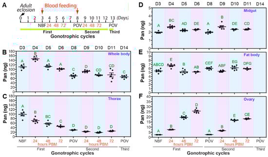 Pan levels in distinct tissues from A. stephensi females during the first two reproductive cycles. (A). Schematic representation of blood feeding protocol and tissue sample collection timepoints. Tissue samples were collected from the whole body (B), thorax (minus legs and wings; (C)), midgut (D), fat body/abdominal body wall (E), and ovaries (F) from non-blood fed (NBF) mosquitoes, at 24, 48, and 72 h post-blood meal (PBM), and 2 d post-oviposition (POV) over two gonotrophic cycles. Gravid females were allowed to lay eggs for 2 d at 72 h PBM. Approximately 5% of gravid females did not lay eggs after 2 d, and these females were excluded from analysis. Each dot represents five pooled tissues except for midguts where ten tissues were pooled for Pan quantification. Bars represent the mean and standard error. The day post-eclosion for each experimental time point is listed at the top of the graph. Different letters indicate statistically significant differences (one-way ANOVA with post-hoc Tukey, N = 6 per time point and three unique biological cohorts).