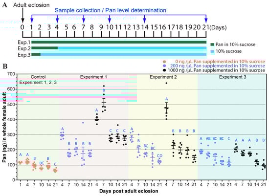 Pan levels in female A. stephensi supplemented with Pan in 10% sucrose. (A). A schematic showing three different Pan provisioning scenarios. In experiment 1, Pan in 10% sucrose was provided throughout the experiment. In experiment 2, Pan in 10% sucrose was provided only for the first 3 days. Thereafter, mosquitoes were only allowed to feed on 10% sucrose. In experiment 3, Pan in 10% sucrose was provided only on the first day. Thereafter, mosquitoes were only allowed to feed on 10% sucrose. Cotton balls soaked with 10% sucrose with or without Pan were changed daily to minimize microbial growth. (B). Female mosquitoes were supplemented with 0, 200, or 1000 ng of Pan/µL in 10% sucrose. Females were collected from 1, 4, 7, 10, 14, and 21 d post-adult eclosion and Pan levels were measured by microbiological assay using Lactobacillus plantarum. Each dot represents Pan levels from the five pooled whole mosquitoes and bars represent the mean and standard error. Different letters indicate statistically significant differences (one-way ANOVA and Tukey’s post-hoc test, N = 6–12).
